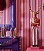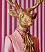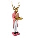 Rendier met goudkleurig dienblad in roze jas en witte broek